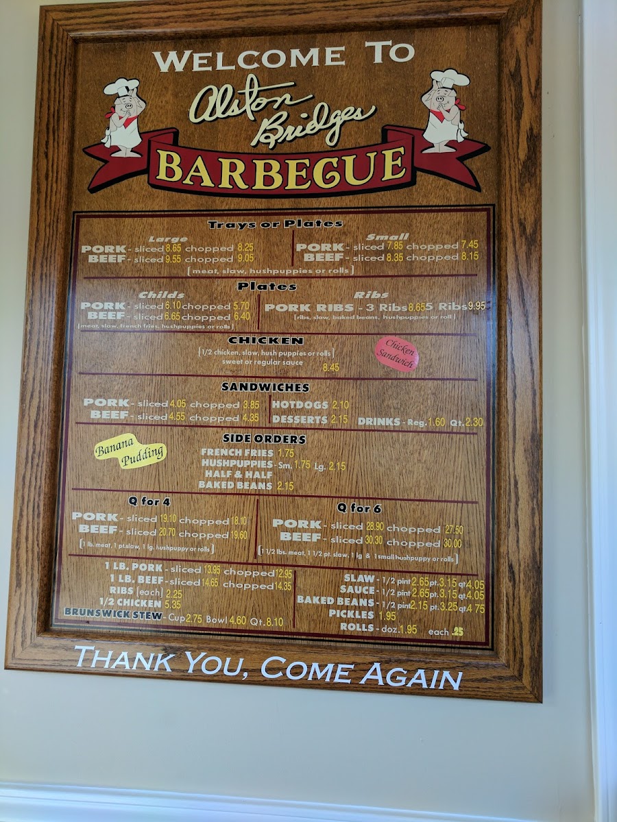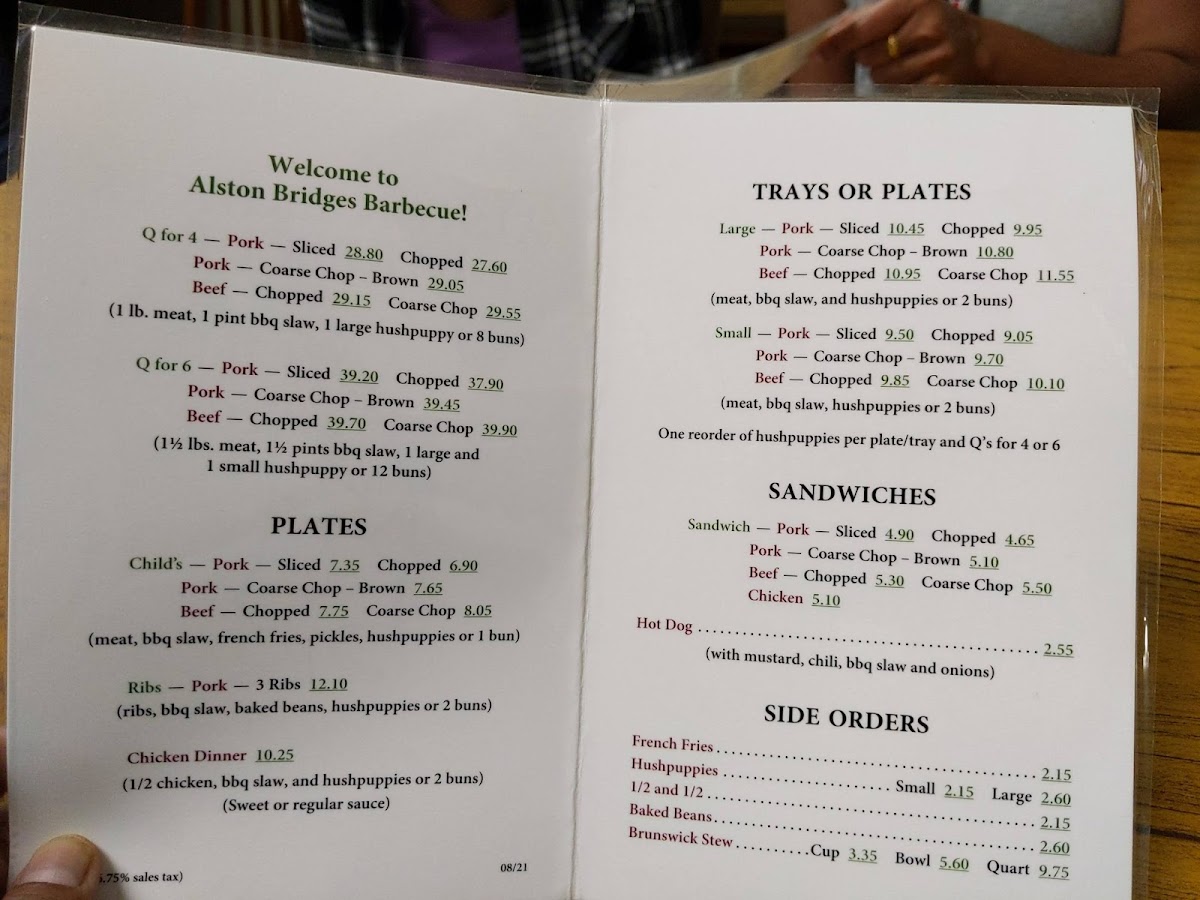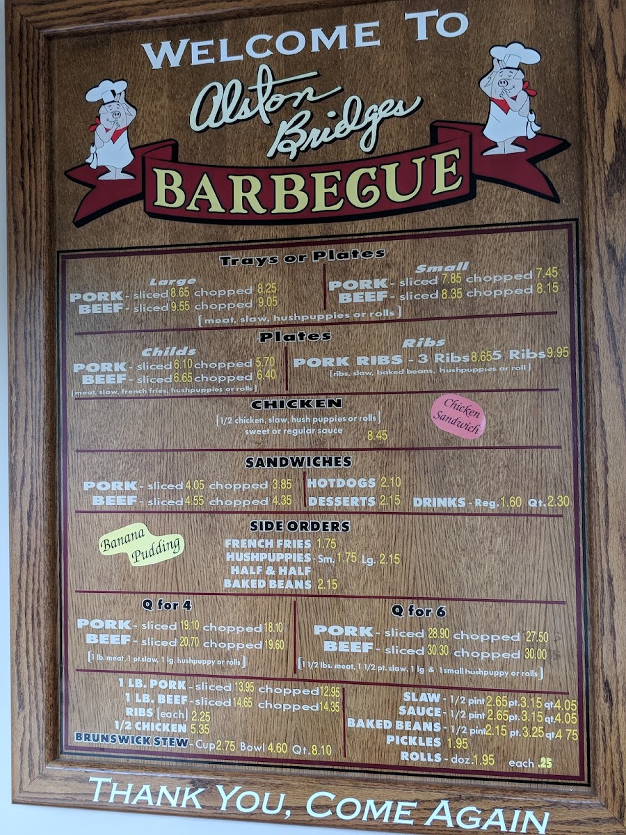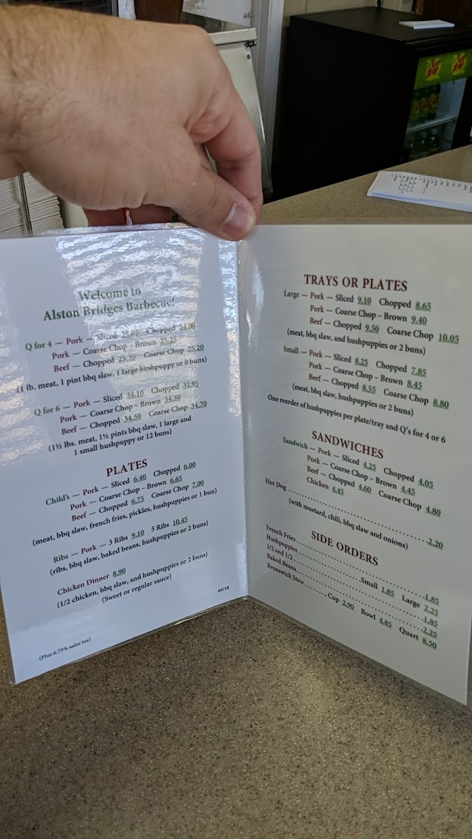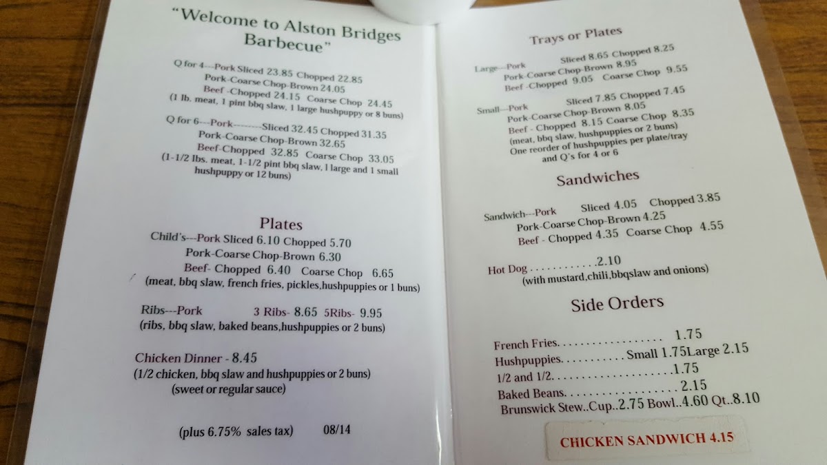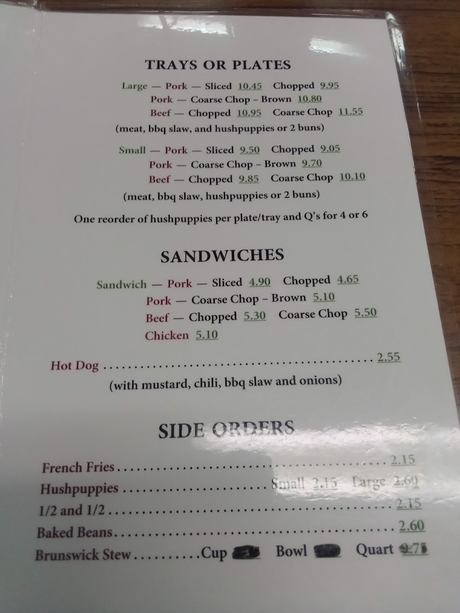 Meat, BBQ slaw, hushpuppies, or two buns. Meat Choice: Beef Chopped (+ $0.70), Coarse Chop + ($0.90), Pork Chopped, Pork Coarse Chop Brown (+ $0.60), Pork Sliced (+ $0.40).